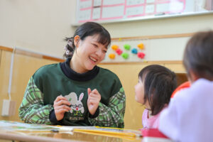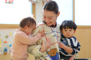 保育は未満児から5歳児までお預かりしています。子どもたちと一緒に遊びを通して保育の仕事を体験することができます。